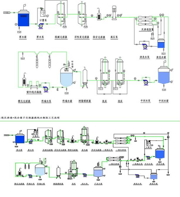 ☆預(yù)處理----二級(jí)反滲透----中間水箱----水泵----EDI裝置----純水箱----純水泵----紫外線殺菌器----拋光混床----TOC分解器----微孔膜過濾器----用水對(duì)象