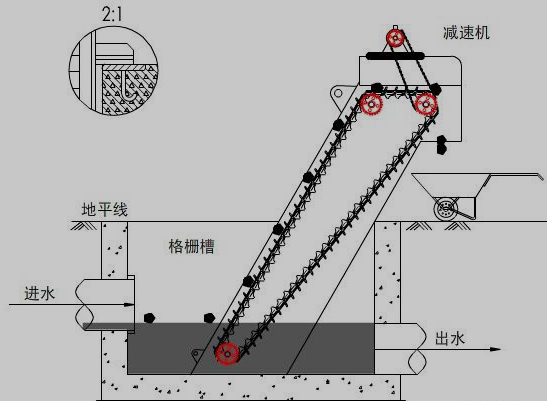 自清式格柵除污機(jī)主要由機(jī)架、驅(qū)動裝置、齒耙及傳動鏈條組成。由ABS工程塑料、尼龍6、尼龍1010或不銹鋼制成特殊形狀的耙齒按一定次序裝配在齒耙軸上,形成一條封閉的耙齒鏈。水下柵片(耙齒)截留污物沿軌上行,當(dāng)達(dá)到項部時,因彎軌和齒輪的導(dǎo)向作用,使相鄰耙齒間產(chǎn)生相對推移運(yùn)動,將污物外推,依自重卸入污物盛器內(nèi)。同時特制轉(zhuǎn)刷將耙齒上微量殘留污物剔除干凈。